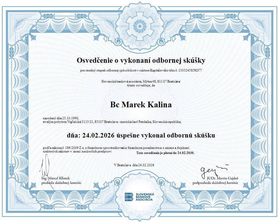 Odborná skúška v sektore Kapitálového trhu od Slovenskej Bankovej Asociácie – SBA (odkaz na osvedčenie)